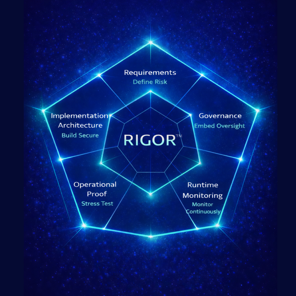 The five pillars of the RIGOR™ Framework: Requirements, Implementation, Governance, Operational Proof, and Runtime Monitoring.